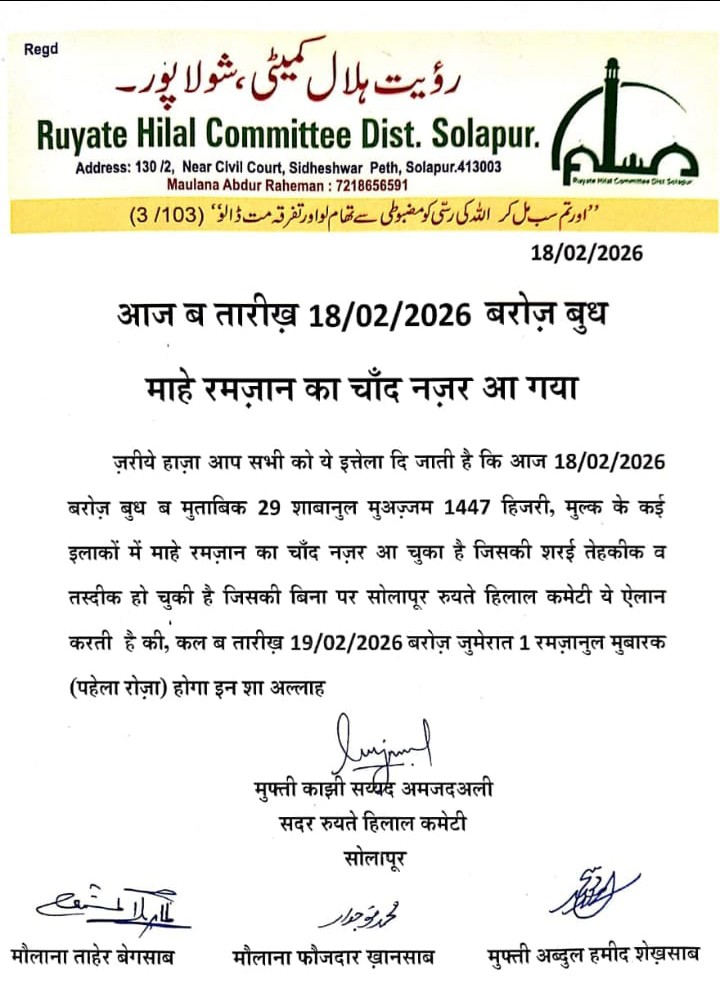 सोलापूर: सोलापूर शहर आणि जिल्ह्यासह देशातील अनेक भागांमध्ये आज, बुधवार दिनांक १८ फेब्रुवारी २०२६ रोजी (२९ शाबान १४४७ हिजरी) पवित्र रमजानचा चंद्र दिसला आहे. शरीयतच्या नियमांनुसार चंद्रदर्शनाची खात्री करण्यात आली असून, सोलापूरच्या ‘रुयते हिलाल कमिटी’ने अधिकृतपणे याची घोषणा केली आहे.