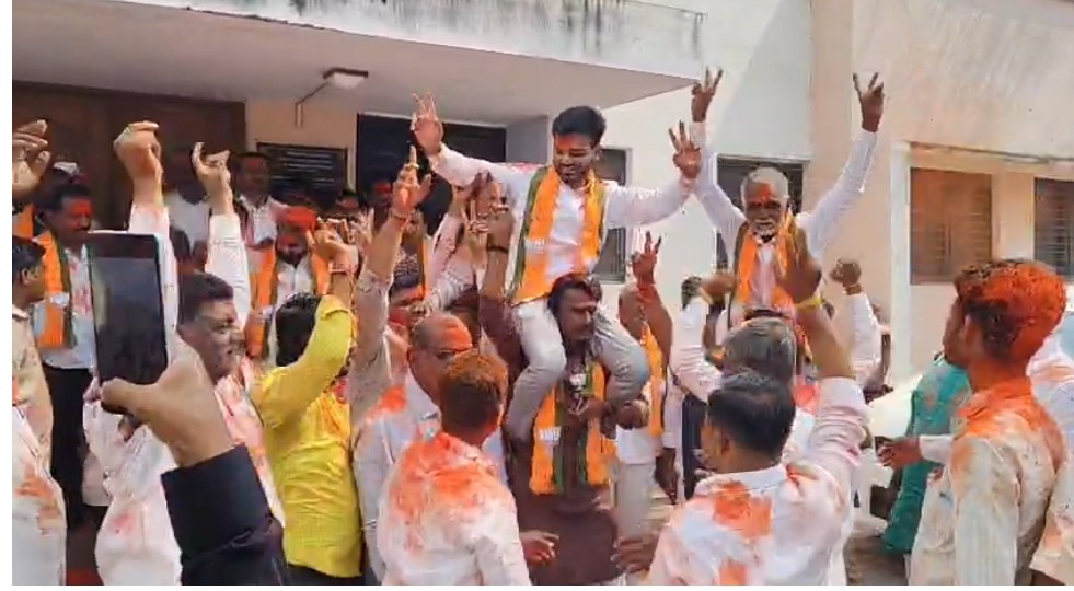 सोलापूर.. दक्षिण पंचायत समितीच्या सभापतीपदाच्या निवडणुकदरम्यान आमदार सुभाष देशमुख व आमदार सचिन कल्याणशेट्टी एकत्र येऊन सभापती व उपसभापती निवड बिनविरोध केली. यावेळी दोन्ही गटाचे नेते व कार्यकर्त्यांनी हलगीच्या तालावर मनसौक्त डान्स केला. जिल्हा परिषद सदस्य रामप्पा चिवडशेट्टी सावकार व सिध्देश्वर कृषी उत्पन्न बाजार समितीचे संचालक मनिष भैया देशमुख यांनी डान्स कार्यकर्त्यांच्या खांद्यावर बसून डान्स केला.