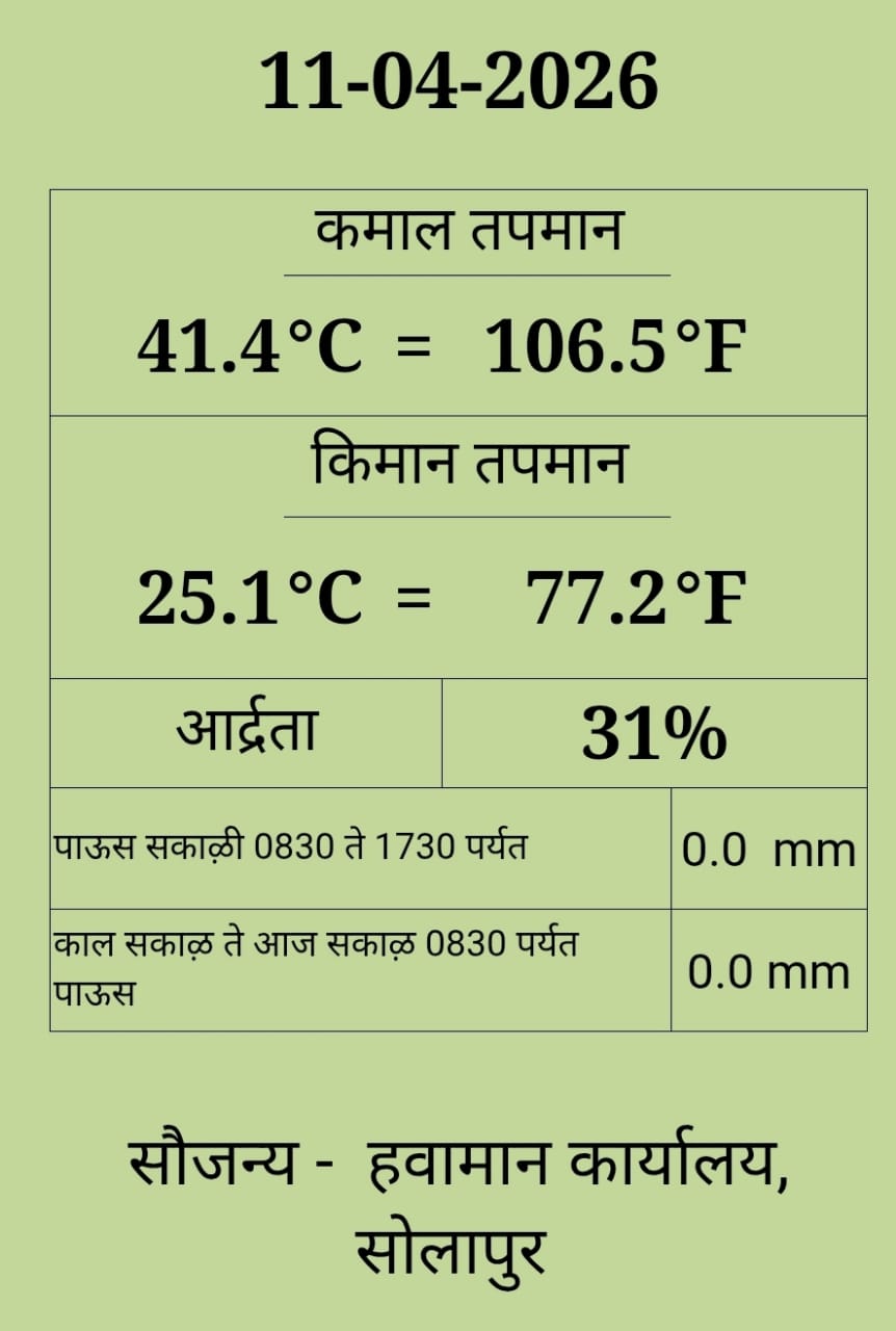 आजच्या नोंदीनुसार सोलापूरचे हवामान खालीलप्रमाणे राहिले: