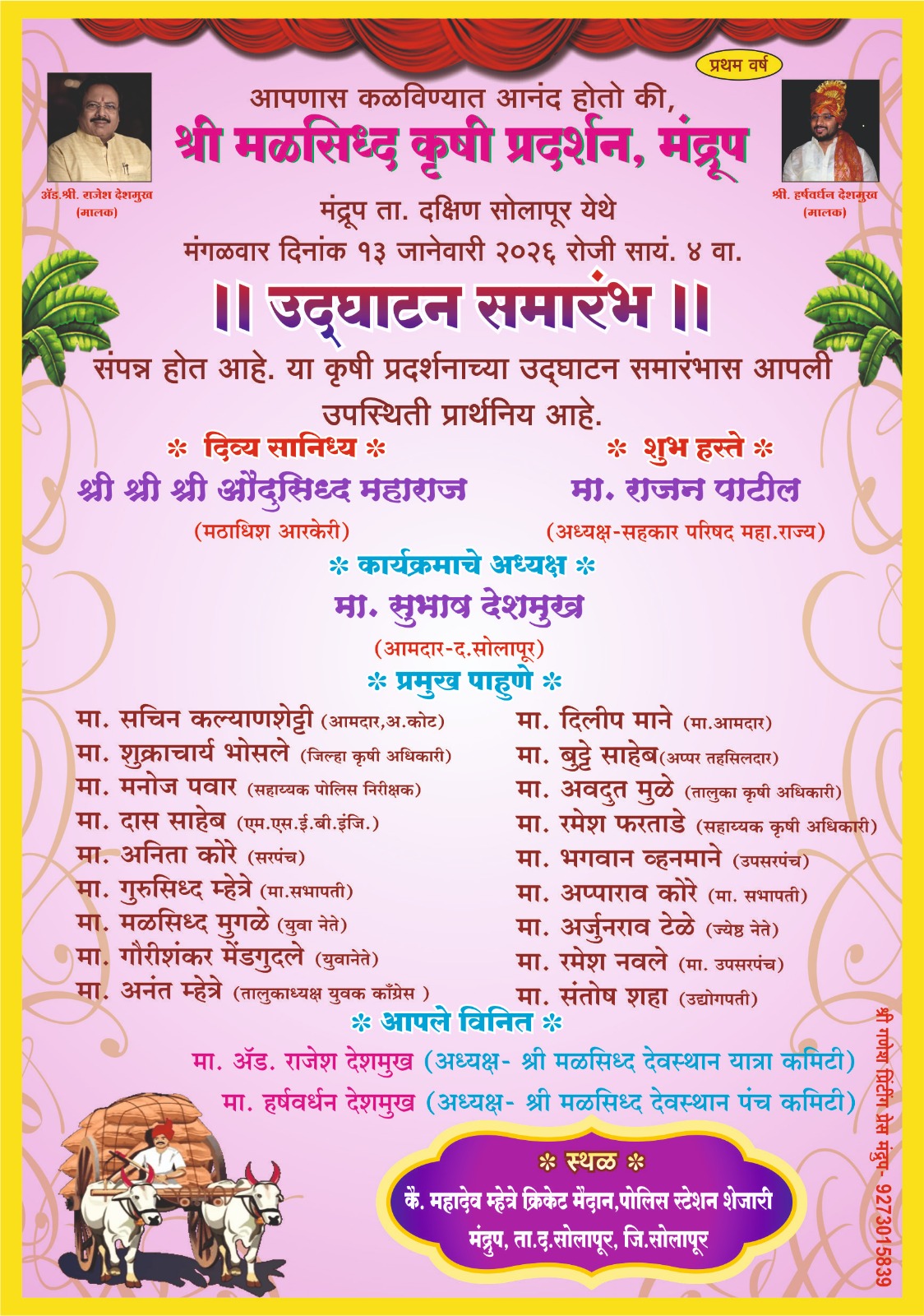 सोलापूर… दक्षिण सोलापूर तालुक्यातील मंद्रूप येथे श्री मळसिध्द देवाच्या यात्रेनिमित्त १३ ते १५ जानेवारी दरम्यान कृषी प्रदर्शनाचे आयोजन करण्यात आले आहे . या प्रदर्शनासाठी ७० स्टॉलची उभारणी करण्यात आली असून यामध्ये अत्याधुनिक शेती औजारांसह विविध आधुनिक यंत्रांचे स्टॉल्स असणार आहेत.